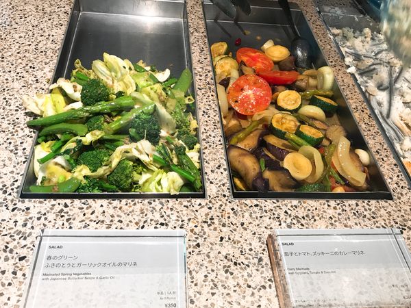 赤坂インターシティの中から行くとすごく分かりづらいので、外から行く方が良いです。メイン、サイド、サラダからデリをそれぞれ選び、スープとライスがつきます。残念ながら、メインにベジっぽいものはなく(この日だけ?)、サイドやサラダから選ばせてもらうしかありません。野菜のデリは色々ありました。