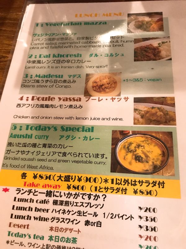 雑居ビルの1階にある小さなバーです。見つけづらいし、ぱっと見では入りづらい店ですが、すごく良い感じのマスターが切り盛りされていました!料理はアフリカンな感じです。ランチメニュー5つのうち、4つがビーガンでした。Today's specialのカレーとクスクスをオーダー。アフリカンテイストでカレーっぽくない食べたことない味が新鮮で、とても美味しかったです!今度は夜に飲みにいきたい。