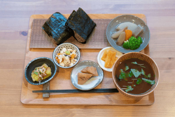 "Vegan Restaurant Sui" offers vegan French cuisine using seasonal vegetables. At "Brown Rice Onigiri Hitoyasumi", not only vegan but also oriental vegetarian (no five pungent roots) local dishes and rice balls.