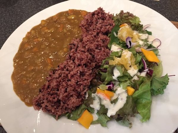 ランチには豆腐ハンバーグ、カレー、パワーサラダの3つのビーガンメニューがありました。今回は野菜と米粉のダルカレーをチョイス。ルーは甘めで、食べやすい味でした。サラダもたっぷり!880円とお手頃なのも嬉しいところ。明るくスッキリした内装のお店です。