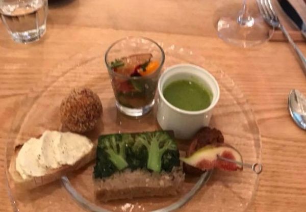 写真は前菜 真ん中上から時計回りに、①ニガウリとミニトマト、プラム、キヌアのマリネ。 ②ズッキーニとジャガイモのスープ ③ベジミートの燻製、いちじく添え ④野菜のテリーヌ(エノキダケ、モロヘイヤ、ブロッコリー) ⑤豆腐チーズのカナッペ ⑥紫芋とさつまいものコロッケ