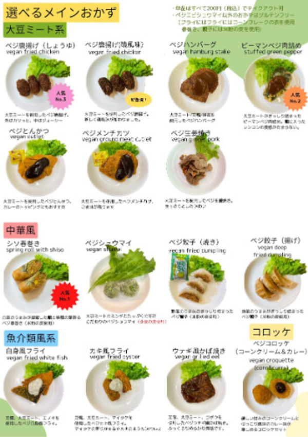 メイン料理は、一番人気のしそ春巻きの他、大豆ミートを利用した、から揚げ・ハンバーグ・メンチ・とんかつ、白身風フライや牡蠣風フライ・ピーマンベジ肉詰め・生姜焼き、カレーコロッケ・コーンクリームコロッケ・餃子・シュウマイ(小麦粉皮使用)など、多彩なメニューからお選びいただけます。