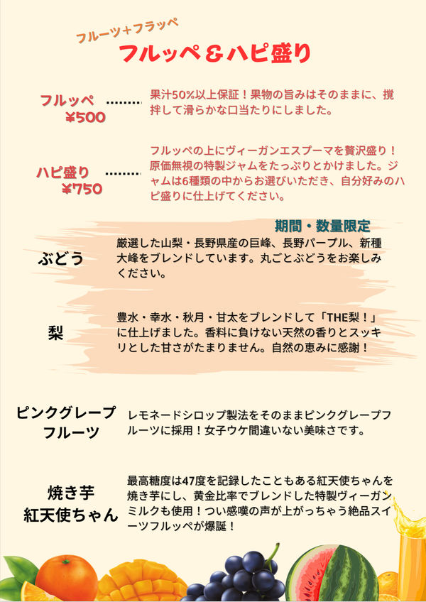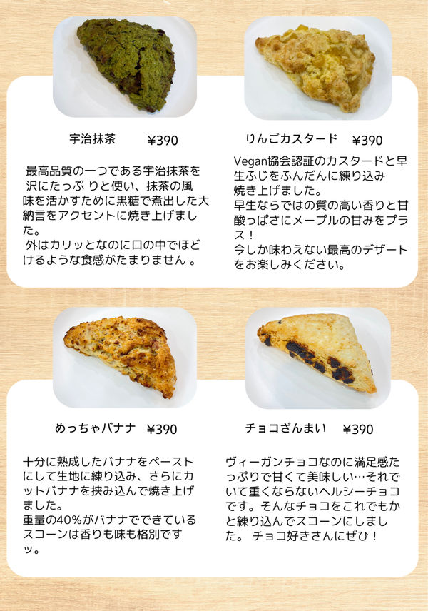 乳製品、卵、上白糖等の動物由来の食材は一切使わず厳選した国産小麦のスコーンや自慢のミネストローネ、旬、産地、追熟までこだったフラッペ。