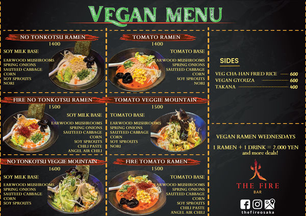 The Fire は、大阪で日本のビーガン料理を体験したいすべての人のために、ランチや深夜の食事を提供するバーです。日本のビーガンと一緒に、ビーガン トンコツ ラーメンとビーガン トマト ラーメンを開発しました。ビーガン 餃子とビーガン チャーハンと一緒にお楽しみいただけます。The Fire では、月に一度、誰もが楽しめるビーガン パーティーを開催しています。見逃したくない方は、Instagram をフォローしてください。