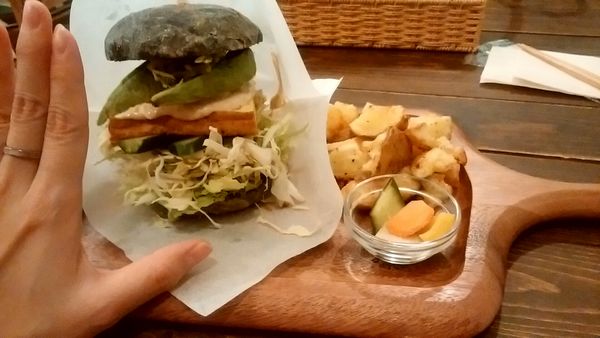 バンズの黒ぽい色はキレート作用たっぷりの麻炭が加えられているから。たっぷりのオーガニック野菜、ヴィーガンミートパティにヴィーガンソースを豪快にかぶりついて食べます。崩れるけれど、野菜もとてもおいしくいただけます。