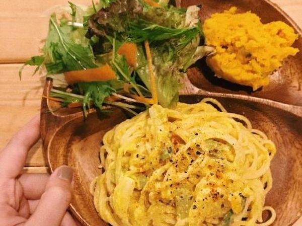 カフェではお豆や野菜をたっぷり使ったビーガンカレーや、海外の方に人気のかぼちゃを使ったクリームパスタなど、ビーガン・ベジタリアン・ノンベジの方、誰でも美味しく食べられるごはん、そして2種のサラダとドリンクがセットになったお得なランチプレートが揃っています☆