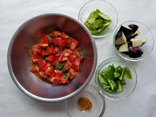 今回は、常備菜となる<トマトの梅味噌和え>と、それを使った簡単素麺、夏野菜の炒め物のレシピを紹介します。